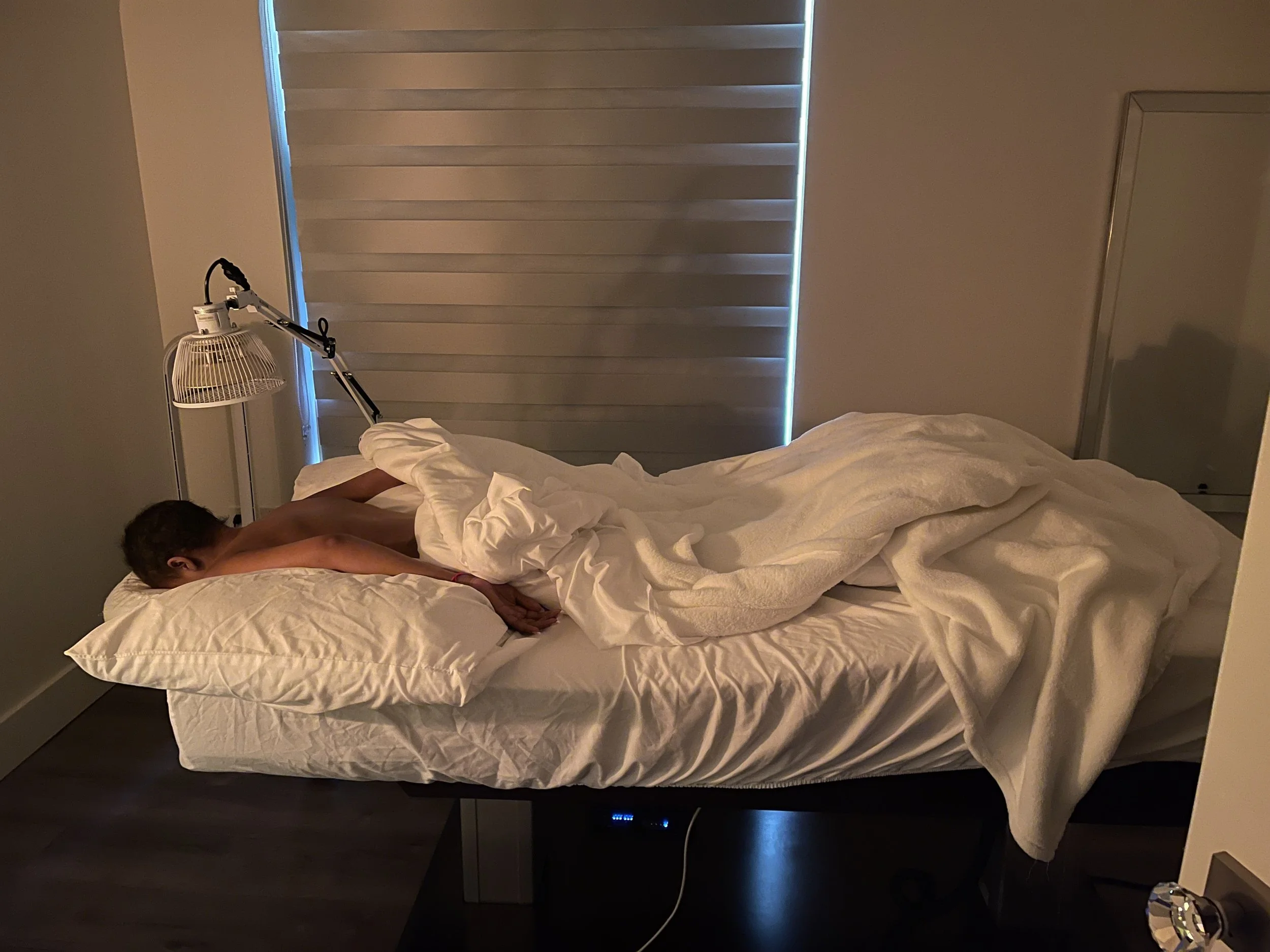 Our state-of-the-art custom built hydrolic massage table allows our guests to get on and off the table with ease. Our table also includes a unique Breast Recess Comfort System to eliminate any pain and/or fears of lying face down during treatment.